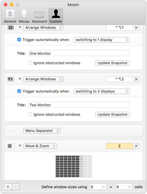 But thankfully, there’s a big ecosystem of third-party apps that perform these tasks, and Moom is far and away the easiest to use. Once installed, it stays in the background, waiting for you to hover your cursor over the green maximize button. From there, you can orient the window in a number of ways, including in horizontal or vertical split-screen mode. You can create keyboard hotkeys, customize Moom for when you’re using your mouse cursor, and create custom window sizes and layouts to meet your needs.