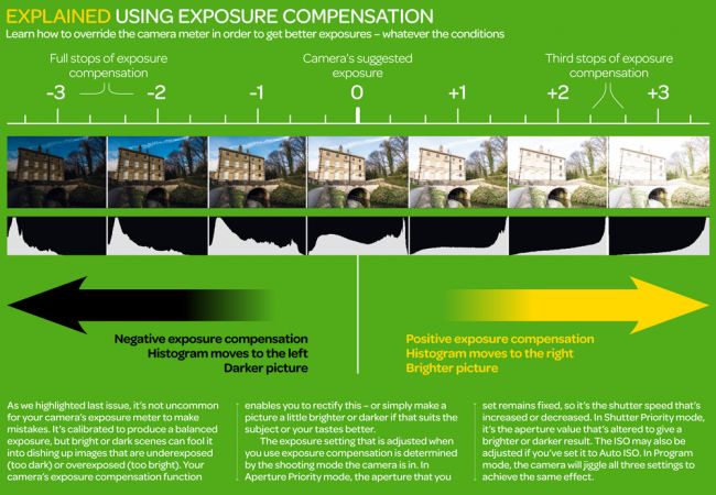 Exposure compensation can be applied in Aperture Priority, Shutter Priority or Program mode. It's also measured in stops: the exposure indicator scale you see in the viewfinder or on your camera's rear display has stops clearly marked on it. You can usually increase or decrease the exposure by up to five stops.