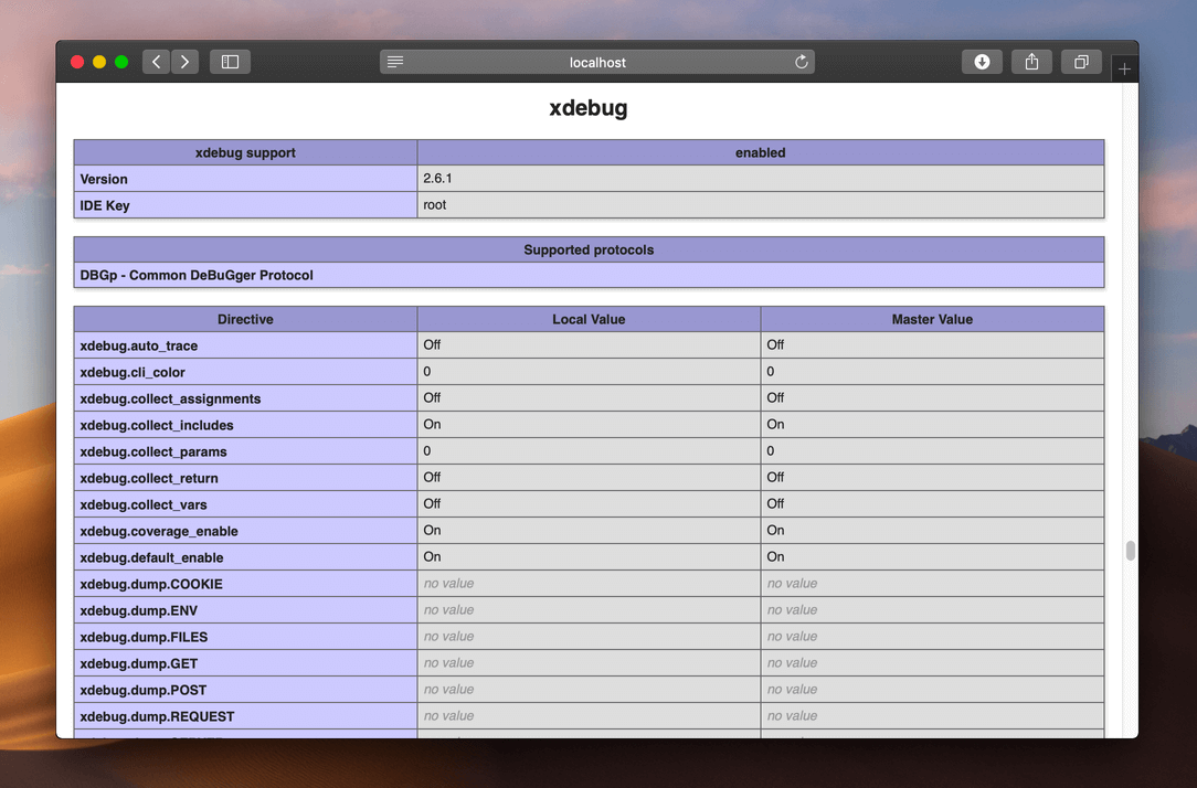Restart Apache with the standard sudo apachectl -k restart command to pick up your changes. You should check the http://localhost/info.php to ensure that Xdebug information is displayed:
