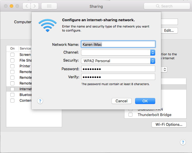 - Next click Wi-Fi Options, this will give you the option to choose a password so that strangers can't jump on your Wi-Fi (it should be least eight characters). Next to Security choose WPA2 Personal and then enter your Password and verify it. (WPA2 is the 802.11i standard for encryption.)