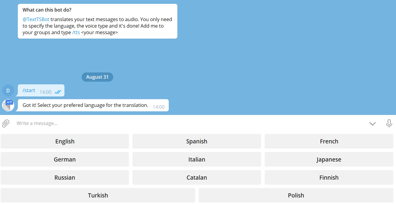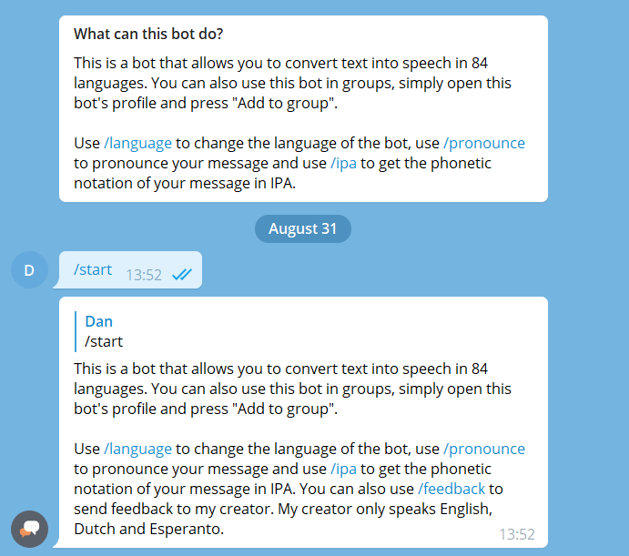 If you struggle to type using an on-screen keyboard---or if you're just downright lazy---Text to Speech can help. As the name suggests, just start speaking and the bot will transcribe your voice into text. It can use both the wit.ai and Google Speech backends.