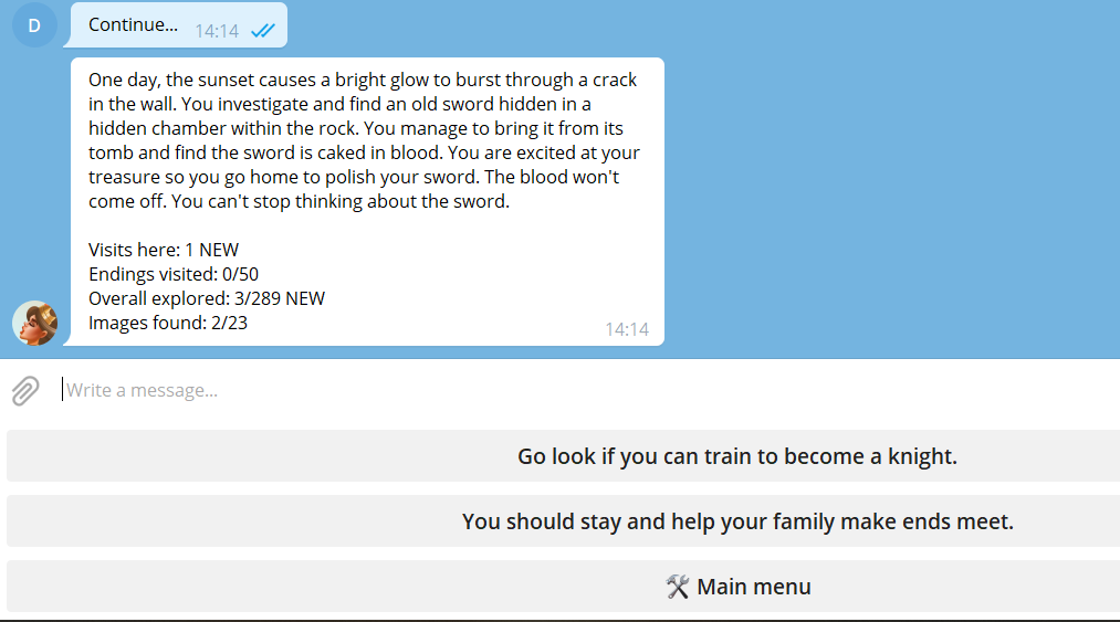 Game of Thorns is an interactive story bot. You play the role of a poor villager in a medieval kingdom.