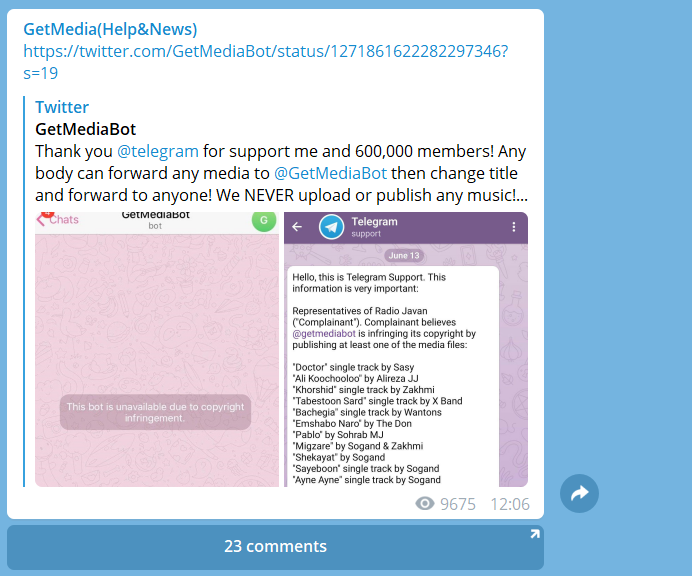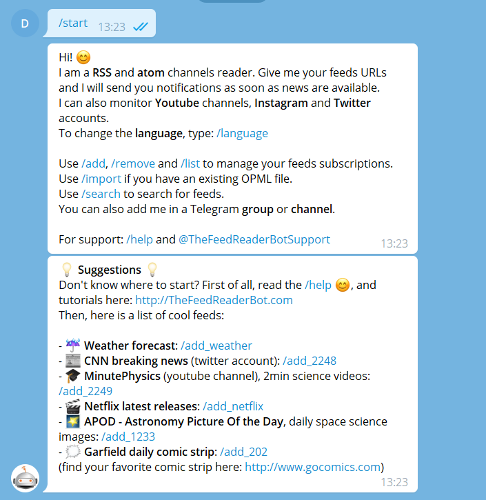 Feed Reader is one of the most useful bots on Telegram. It works with regular RSS feeds, but can also read public Facebook pages, and YouTube, Instagram, and Twitter accounts.
