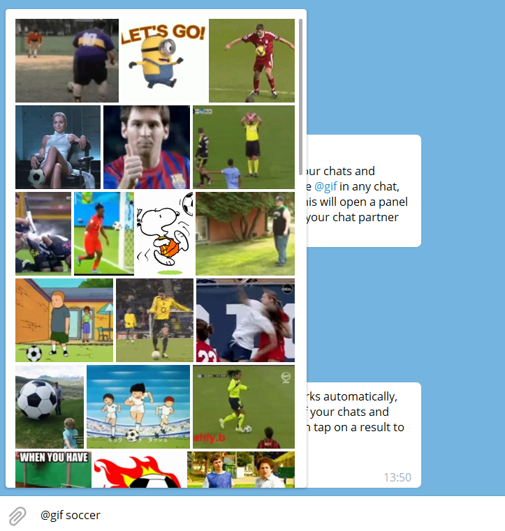 Giphy GIF Search works across all your existing Telegram chats. Type @gif [search term] to find the perfect animation.