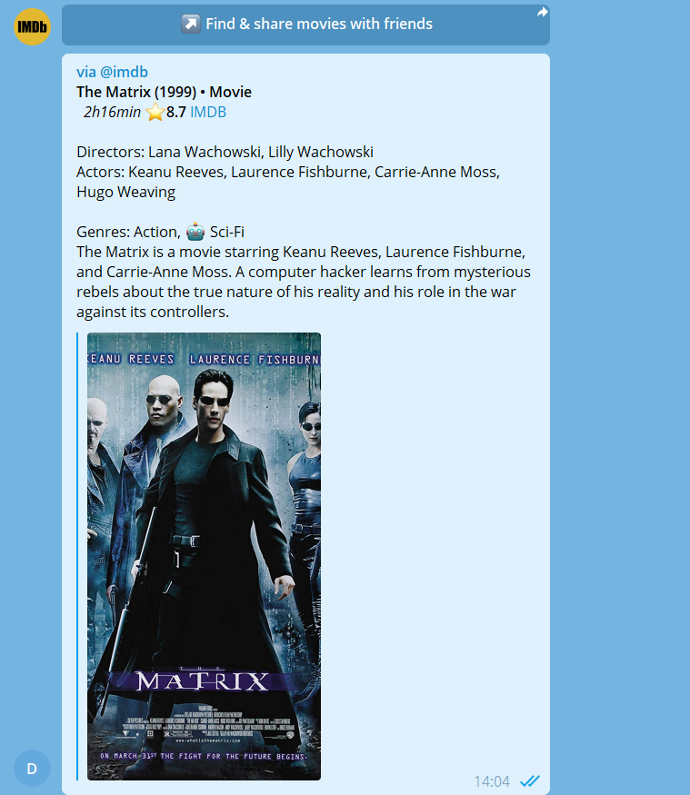 The IMDb bot will scan the Internet Movie Database to provide details on movies you're interested in.