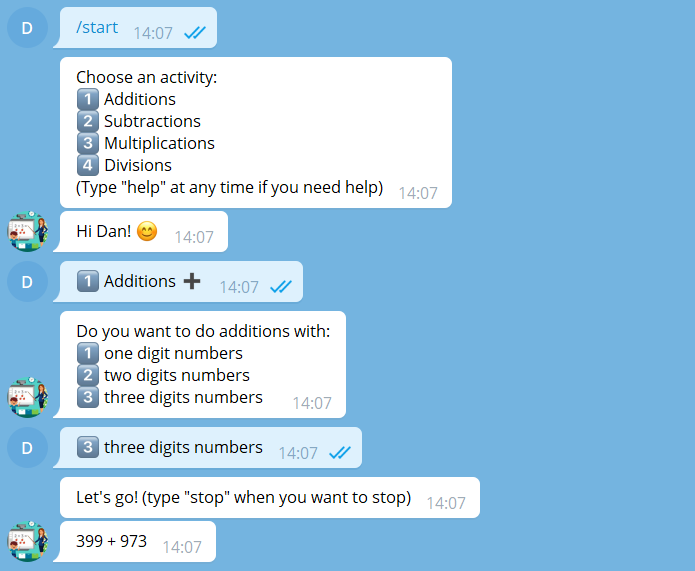 Math Teacher Bot is a Telegram bot for kids. It will let your children practice their basic math skills through a series of questions that are based on the four basic skills of addition, subtraction, multiplication, and division.