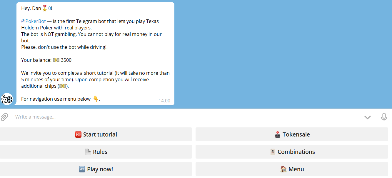 Time for a bit of fun. PokerBot lets you play Texas Hold 'Em against both your friends and random Telegram users.