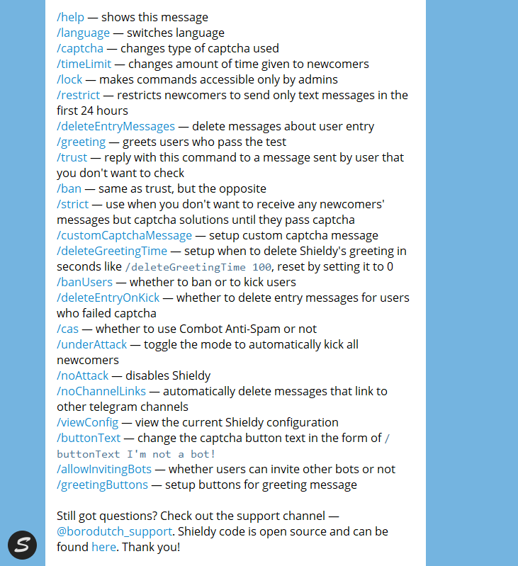 Telegram and WhatsApp both suffer from their fair share of spam. Shieldy has a few build-in commands that'll help you to start fighting back.