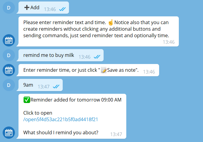 The bot can understand natural language, thus allowing you to set reminders with your voice. It can also create recurring reminders and postpone existing reminders.