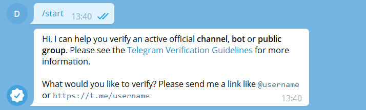 Verify Bot is Telegram's official verification tool. It can help you get that prestigious blue tick on your own account. The bot will guide you through the entire verification process.
