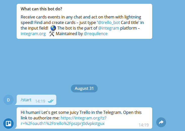 This bot lets you receive card events, perform actions, and create new cards. You will need to authorize the bot to access your Trello account.