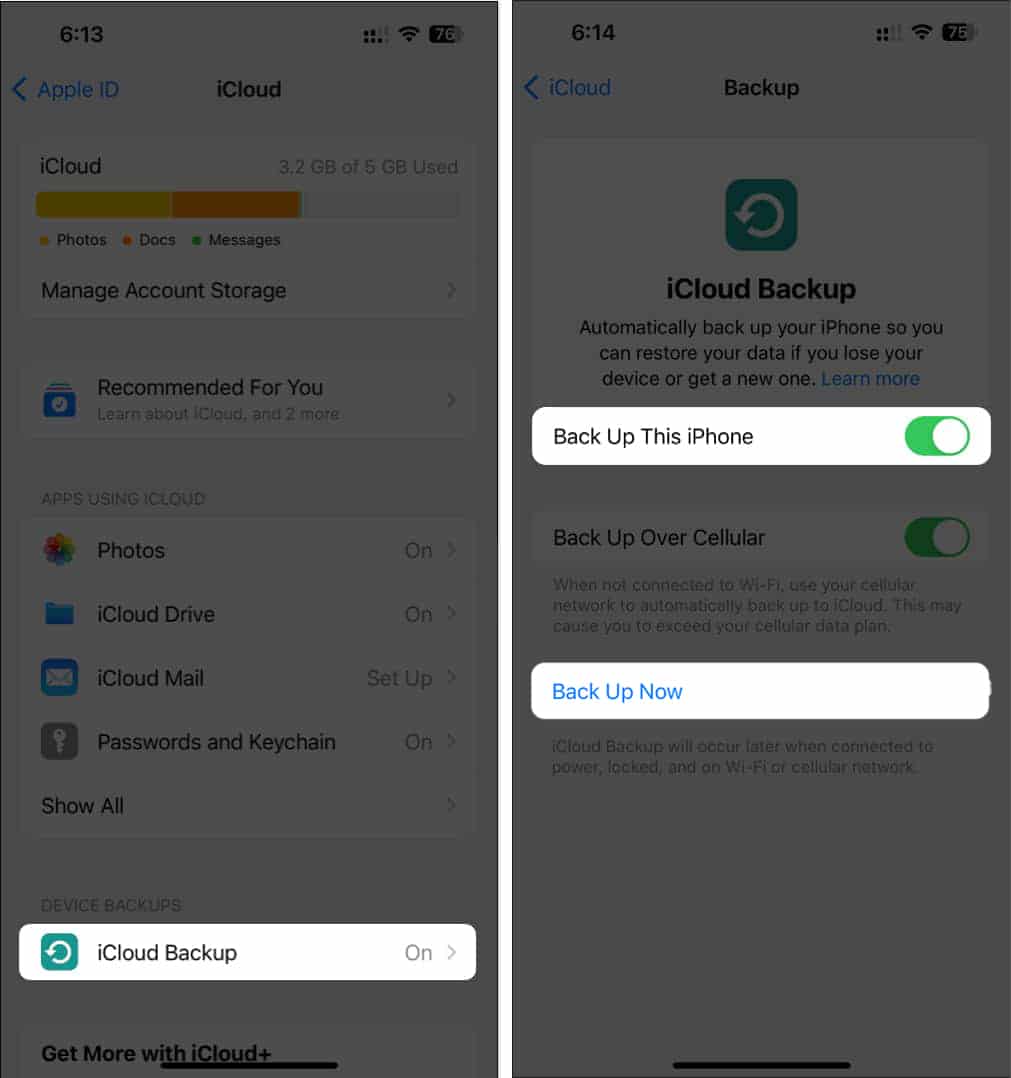 On 5G–supported models, you can also turn on Backup Over Cellular. - Then, tap Back Up Now to create a iCloud backup.