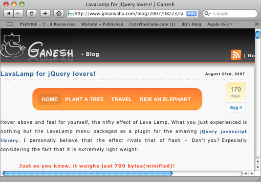 Lavalamp is a simple, ready to use JQuery plugin which allow you to create a stunning effect over your horizontal navigation bars. Nice to see, easy to implement.