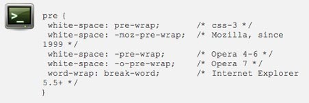 This tutorial shows how to wrap text within pre html tags. It’s useful for displaying code on your site, especially when lines of code are quite long and end up breaking your site’s layout (especially in IE). It’s a relatively simple and there are a few different options presented.